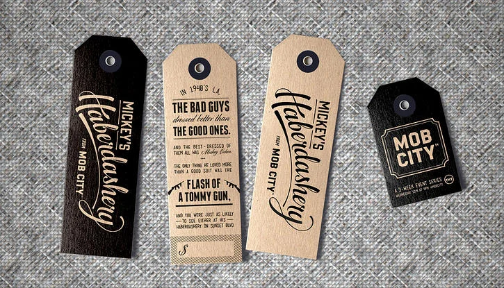 Branded hang tags and bags told the story of Mickey Cohen and reminded shoppers when to tune in. While Cigarette Girls shared fully functional, period-accurate sewing kits and match-books to anyone who didn’t have time to browse.